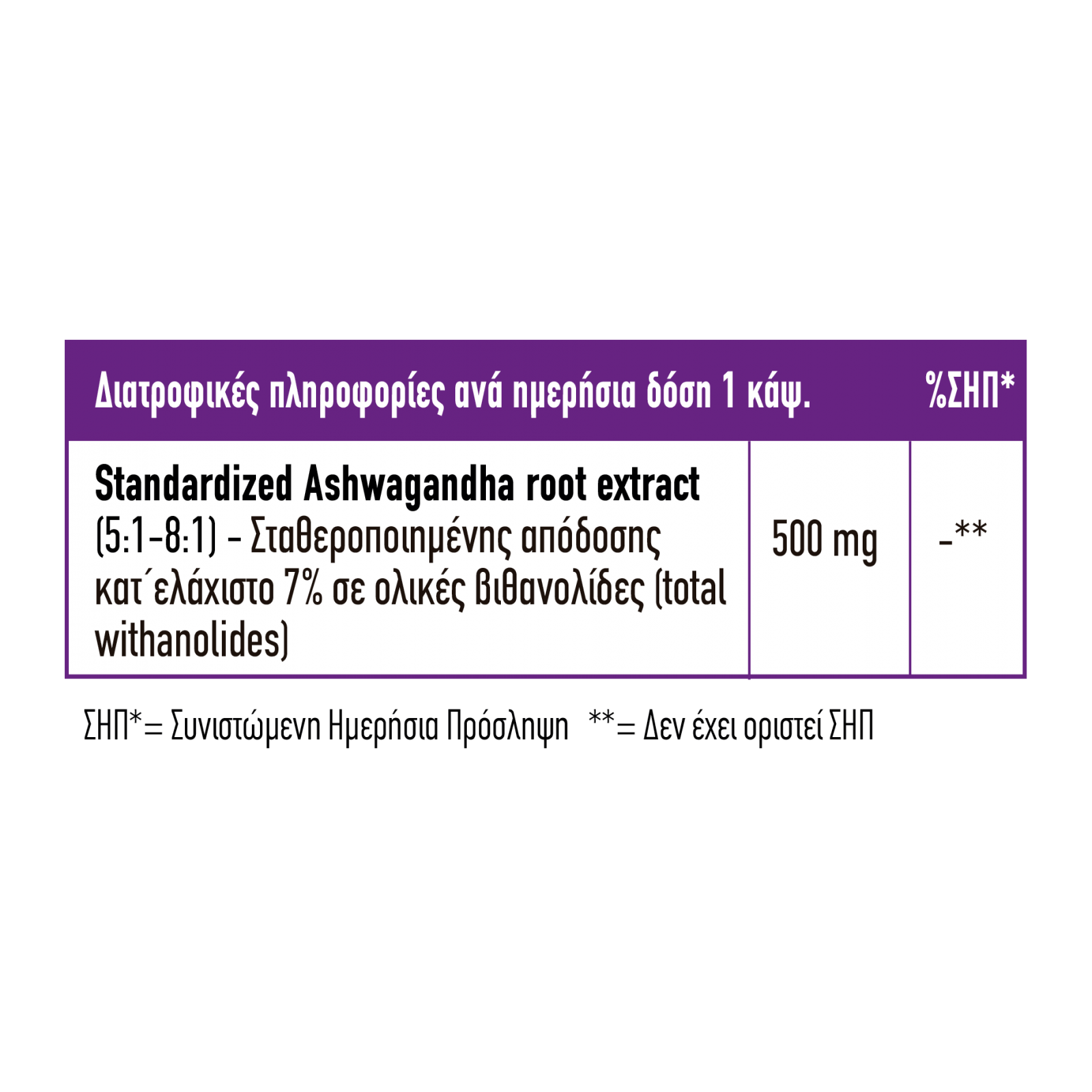 ΣΥΣΤΑΤΙΚΑ: τυποποιημένο εκχύλισμα ρίζας ασβαγκάντα (8:1) (withania somnifera) σταθεροποιημένο να αποδίδει κατ’ ελάχιστο 7% βιθανολίδες. Συστατικό κελύφους κάψουλας φυτική κυτταρίνη, τυποποίηση έως 7% με αζωτούχες ρίζες.